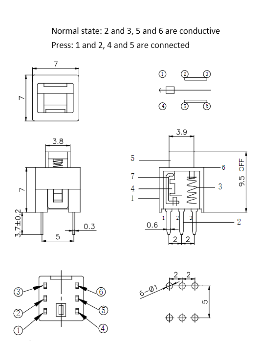 No IP RatingMini-Ein-/Ausschalter, hoher/flacher Kopf, zweireihig, 6-polig, 7x7, selbstverriegelnd
